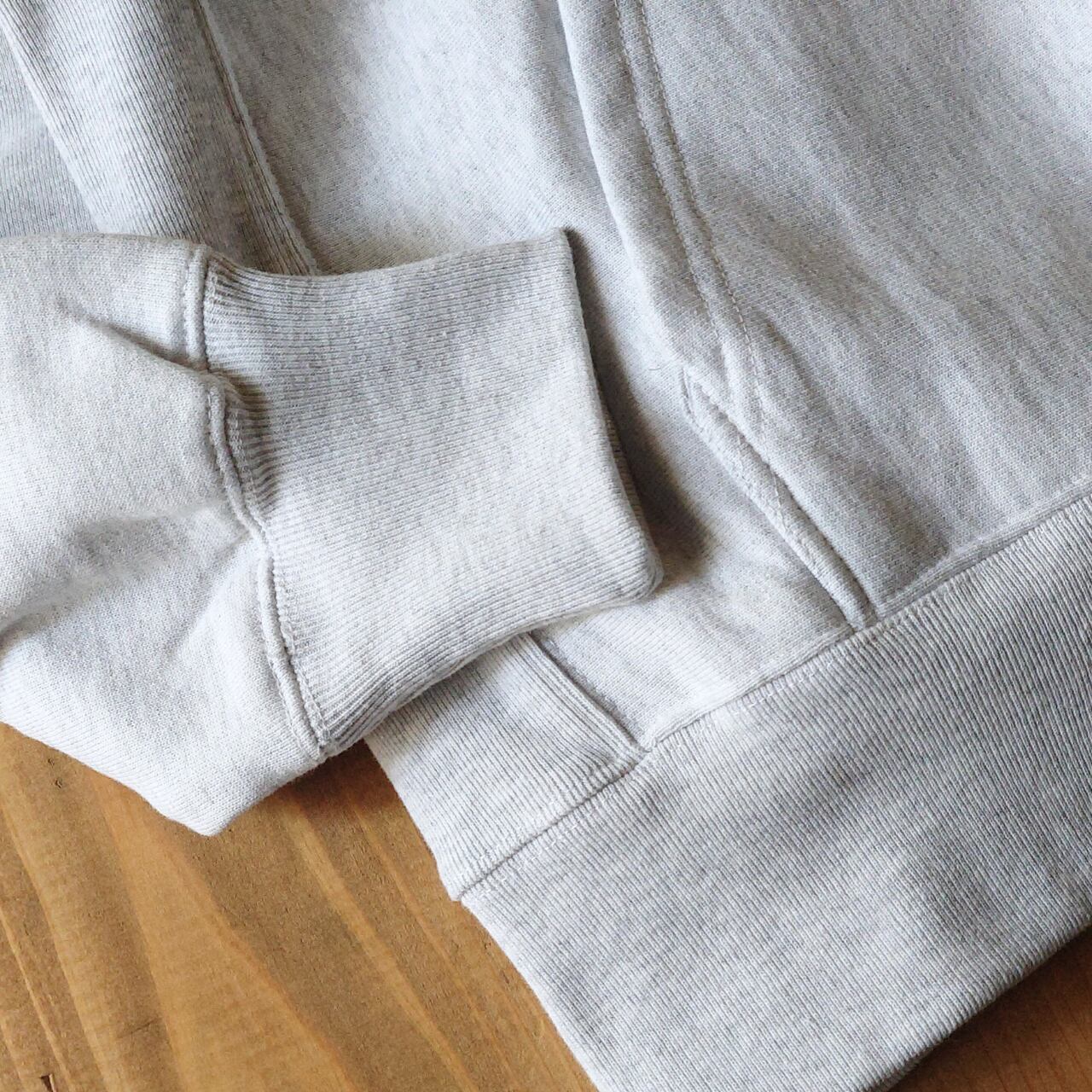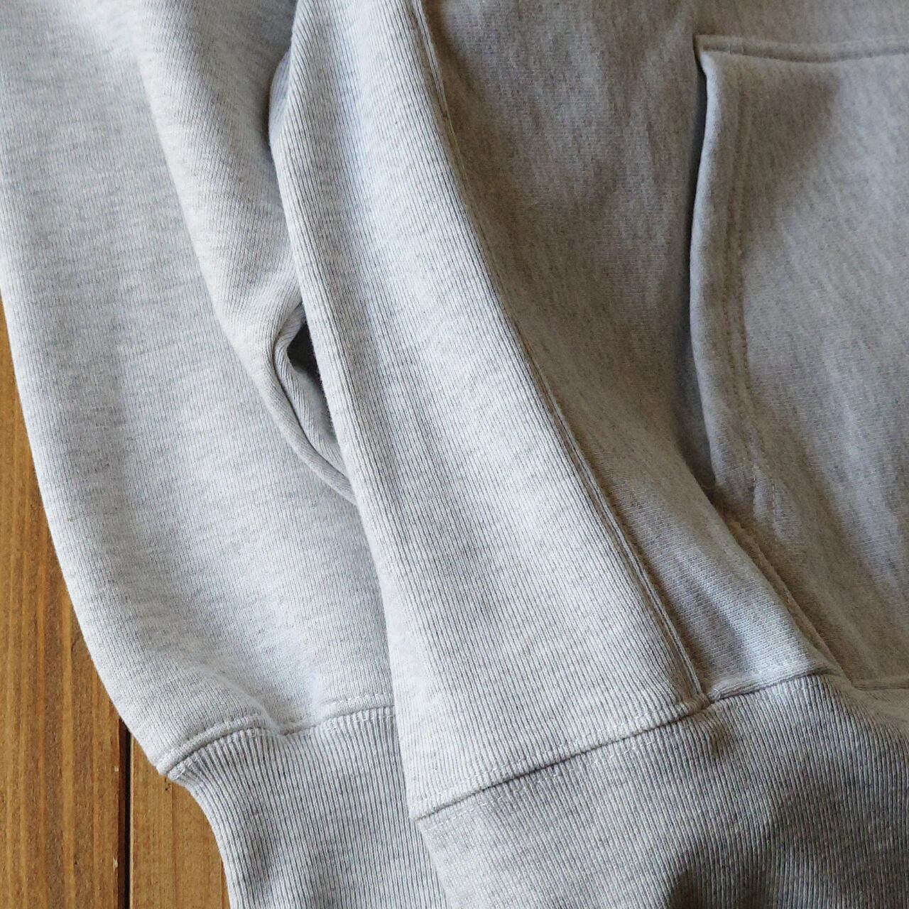 ヘビーウェイト12.0オンスのボディは、表面はざら感のあるざっくりした風合いで、乾いた硬めの厚手生地、中は裏起毛が特徴。手に取るとしっかりとした厚みを感じる。カラーはアッシュをチョイスし、硬めの生地でも柔らかい印象を残した。